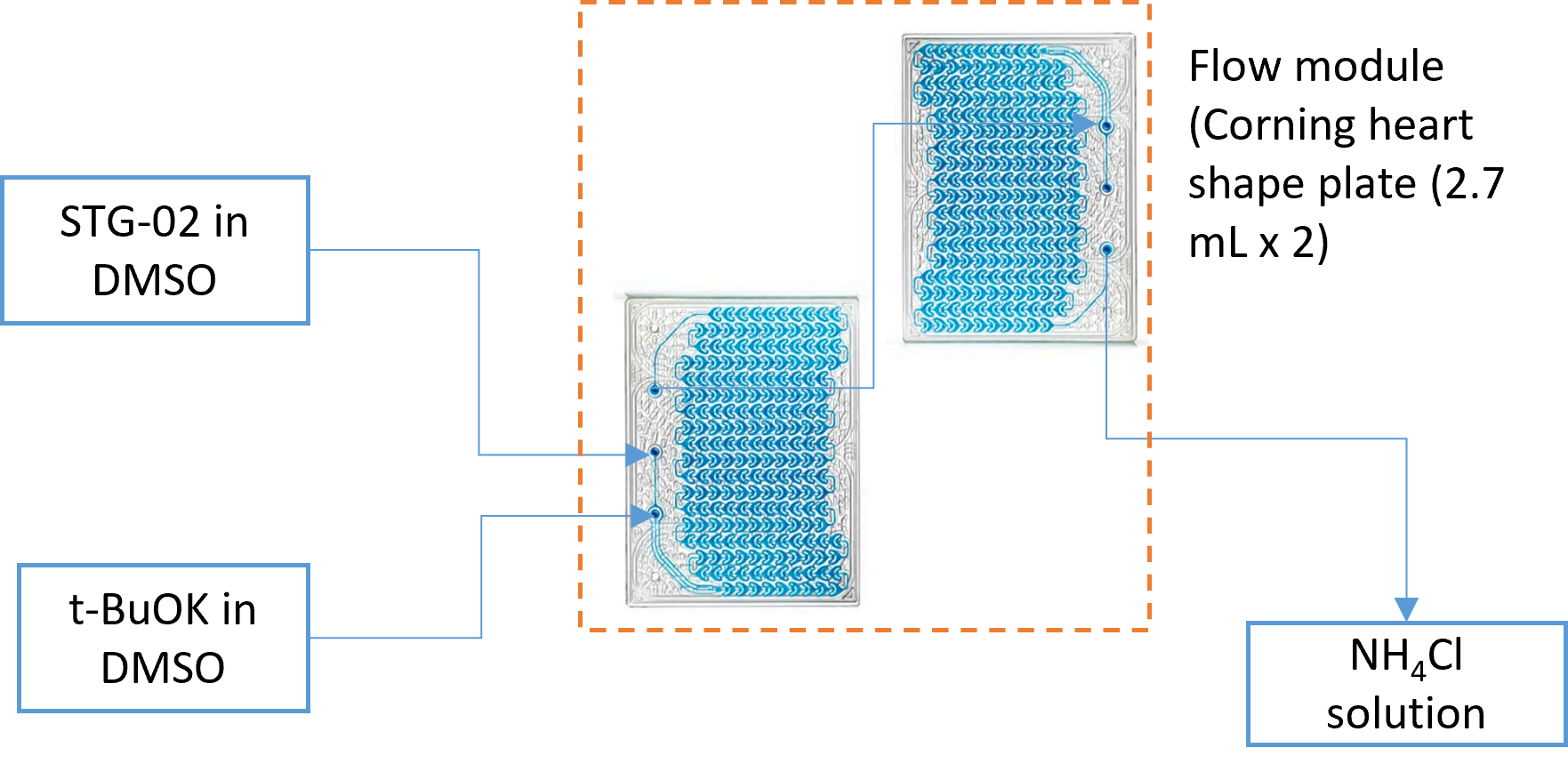 Feasibility and early optimization were performed in an Advanced Flow Reactor (AFR; G1) equipped with two heart-shaped plates (2 × 2.7 mL; total internal volume 5.4 mL). The initial trial demonstrated product formation with a profile similar to batch at a Residence Time (RT) of 4.7 minutes (Figure 1).