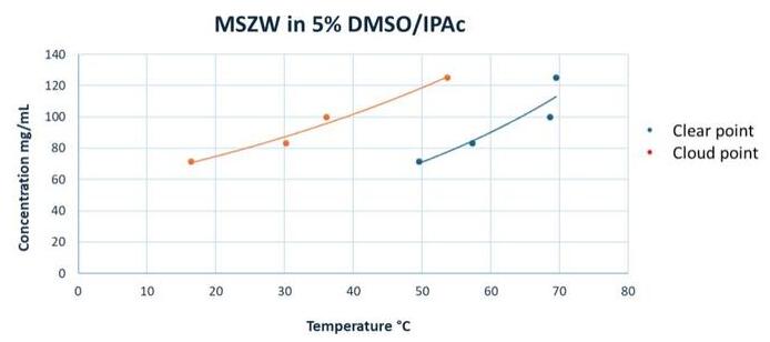 Figure 1 : MSZW profile (5% DMSO/IPAc). The broad metastable zone between the clear point (red) and cloud point (blue) curves is significant across the concentration range.