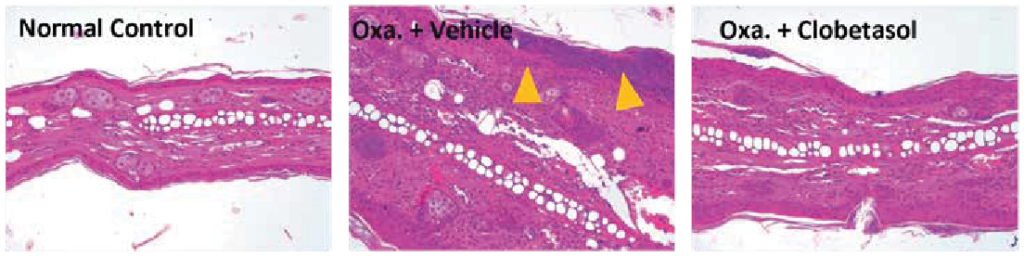 Oxazolone application induces AD-like skin symptoms in mice that manifest as histopathological changes such as acanthosis (thickening of the epidermis), parakeratosis (excessive keratin formation), hyperkeratosis (skin thickening due to excessive keratin deposition), and continued inflammation. Treatment with clobetasol attenuates these AD-like skin symptoms as depicted from the figure 2A (H & E staining) and figure 2B (ear histopathology score). Clobetasol is a potent topical steroid exhibiting anti-inflammatory, immunosuppressive, vasoconstrictive, and cellular effects that bestow it therapeutic efficacy against dermatological conditions like eczema, dermatitis, psoriasis, etc.
