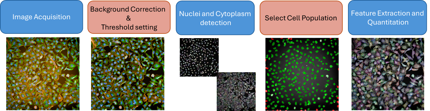 Advanced image analysis is central to the success of HCS-based experiments. Each cell contains rich quantitative information that can be extracted using sophisticated analysis pipelines. Standard workflows include image correction, segmentation, quality filtering, and object-based quantification.