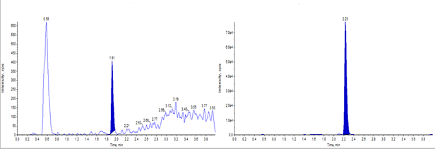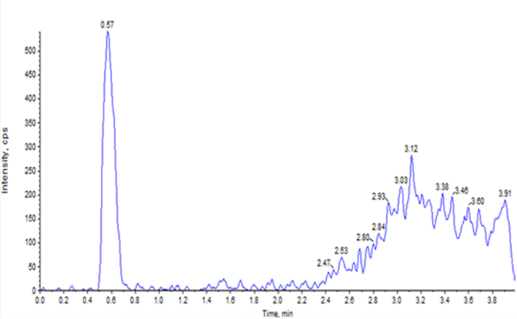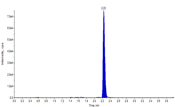 Together, these steps improved signal-to-noise ratios and minimized false positives, ensuring more reliable quantification. Thorough sample pre-treatment and cleanup are critical to eliminate potential interferences and maintain assay robustness. Representative chromatograms illustrating blank interference and internal standard response are shown in Figure 1.