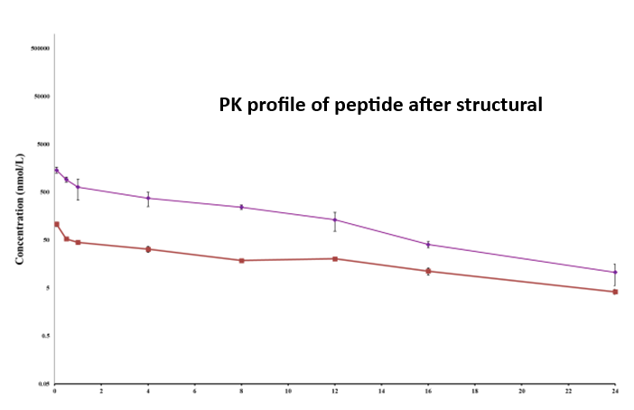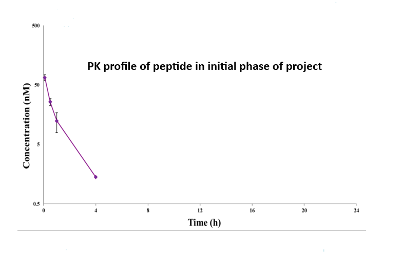 Figure 3: Pharmacokinetic (PK) profiles of the peptide across two project phases. The top panel illustrates the PK behavior during the initial phase, while the bottom panel shows the profile following structural modification. Concentration (nM) is plotted against time (h), demonstrating the impact of molecular changes on systemic exposure and clearance.